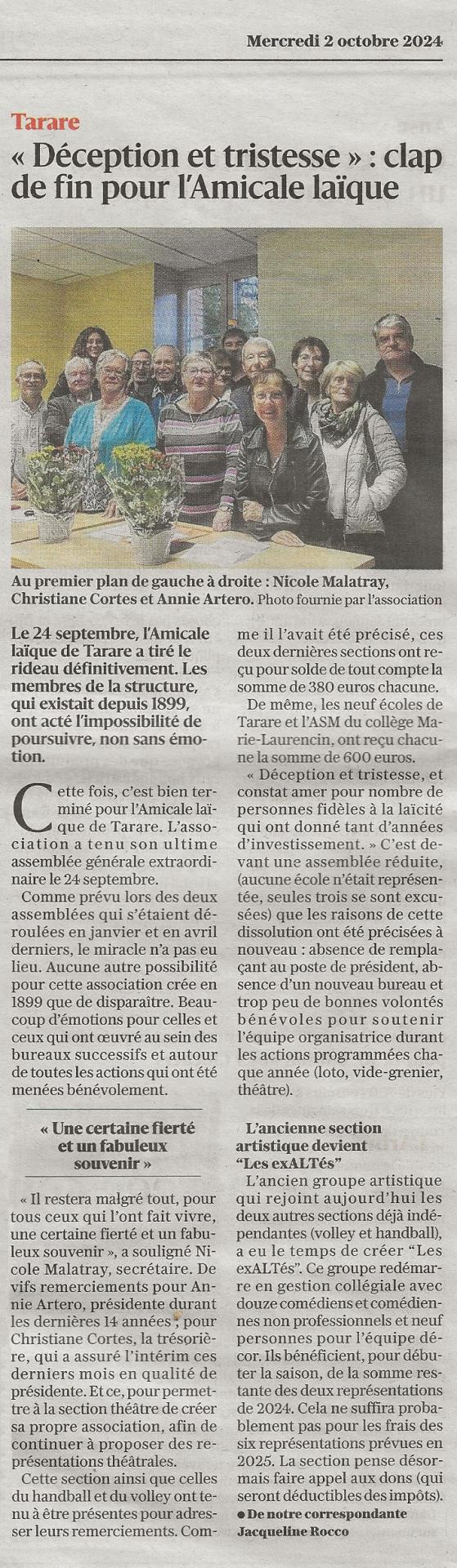 Article du Progrès du 03 octobre 2024 relatif à la dissolution de l'ALT